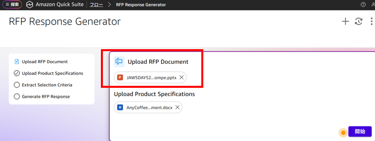 こちらの資料を、「Quick Flows」>「RFP Response Generator」にアップロード。