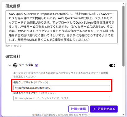 「優先ウェブサイト」には、AWSの公式ページのURL(https://docs.aws.amazon.com/)を入力します。
